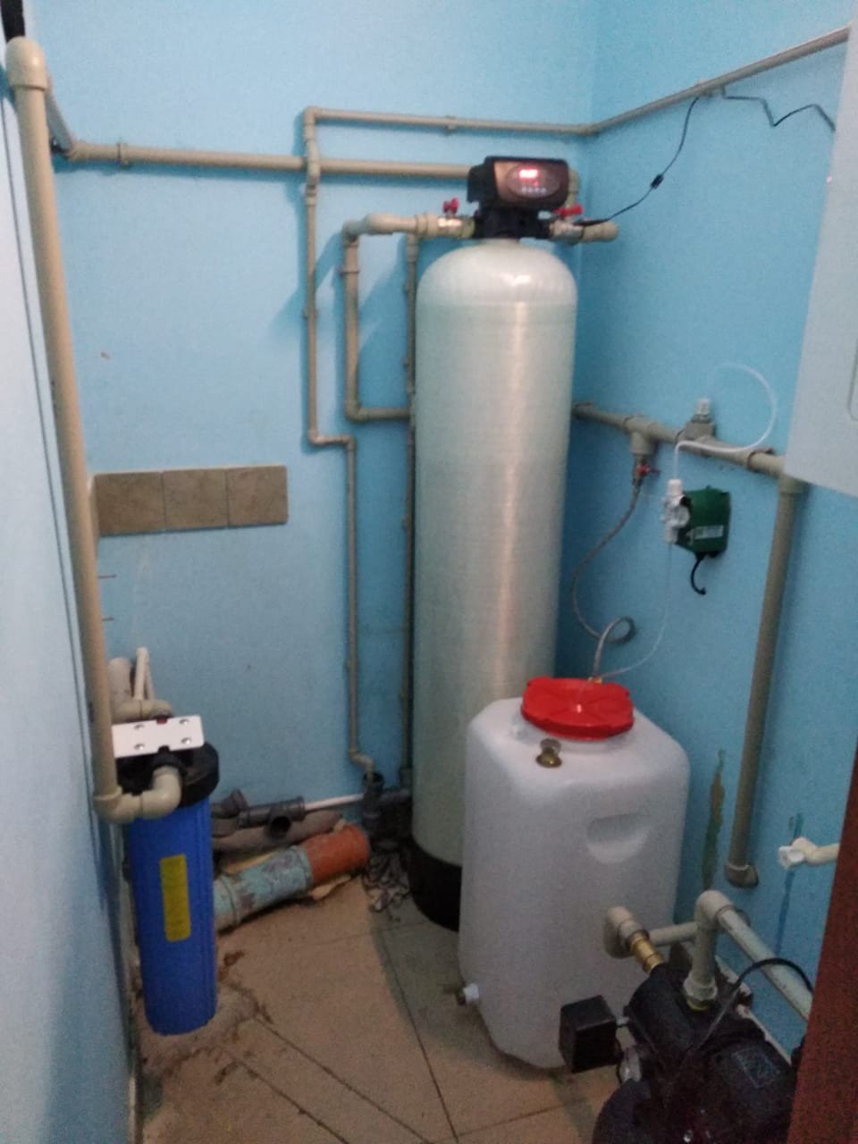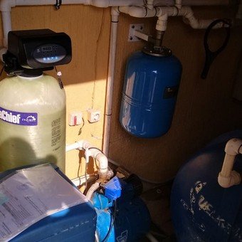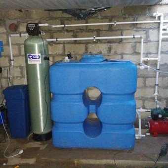 Механическая очистка, установка накопительной емкости 1м3, умягчение воды, установка насосной станции, обеззараживание воды